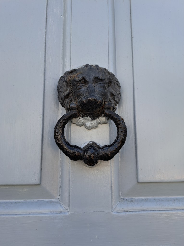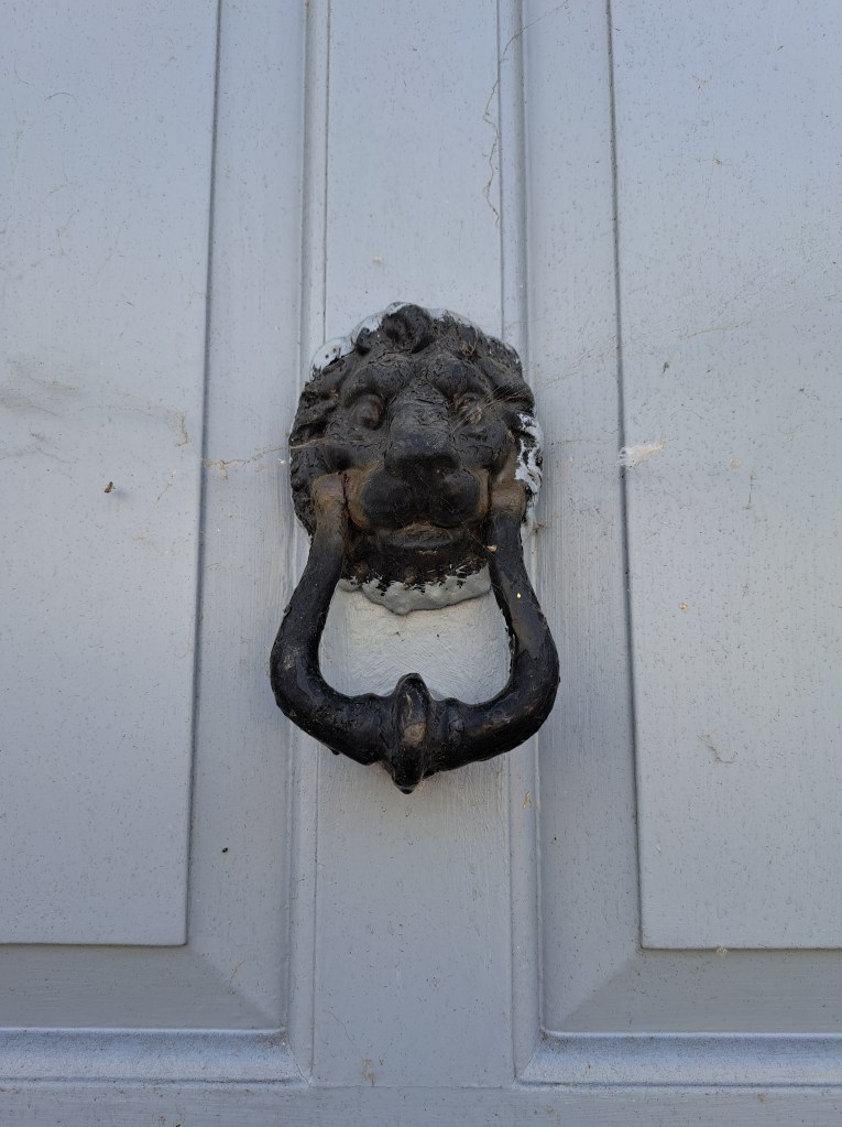 Two door knockers. Is the first a lion? Perhaps the other is a dog.