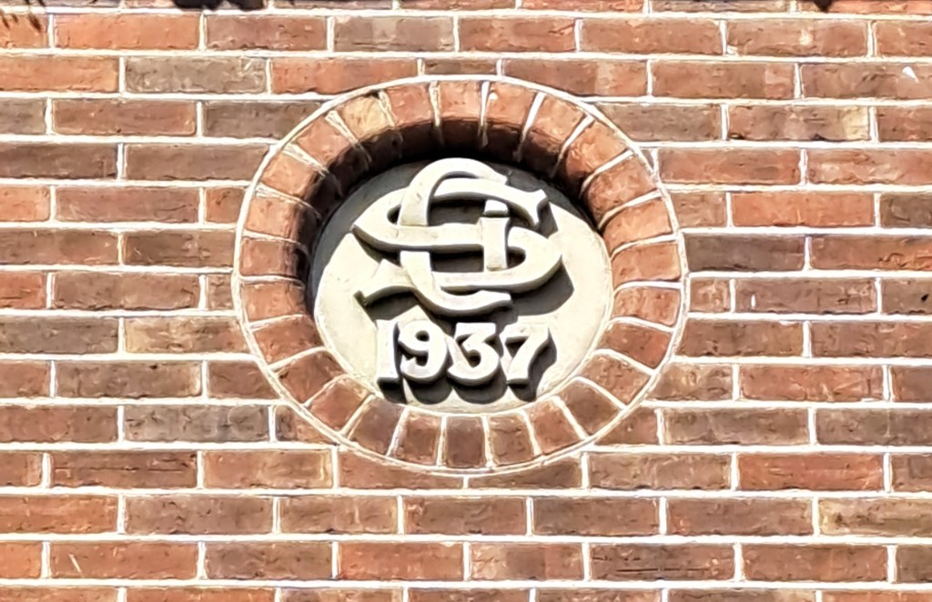 High up on the wall at 115 Pyle Street is this sign. The entwined letters are S and G. Kelly’s Directory from 1935 tells us that 115 was occupied by S Guy Ltd., corn chandlers.